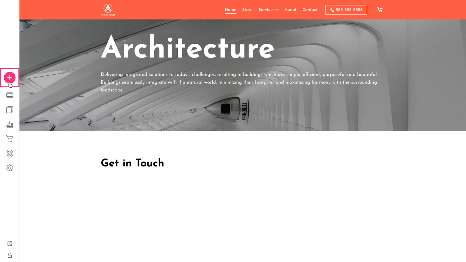 - Hover over the left sidebar of the Site Editor and click Build (+) button: