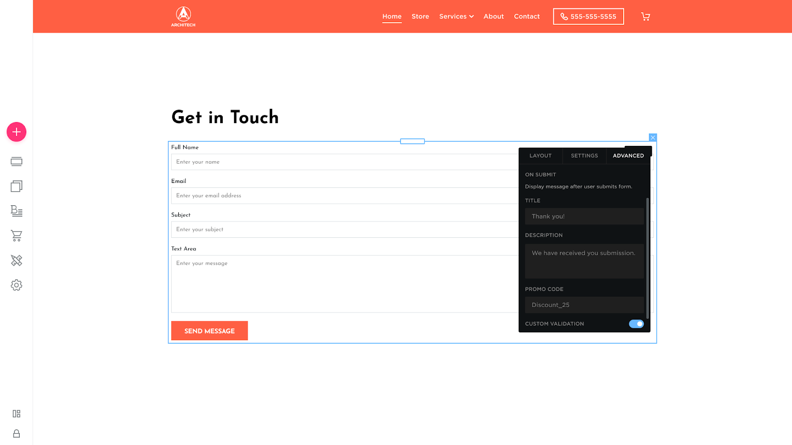 In the Advanced tab, you can create a Thank-You message for submitting the form, add a promo code, and modify the Contact Form appearance.
