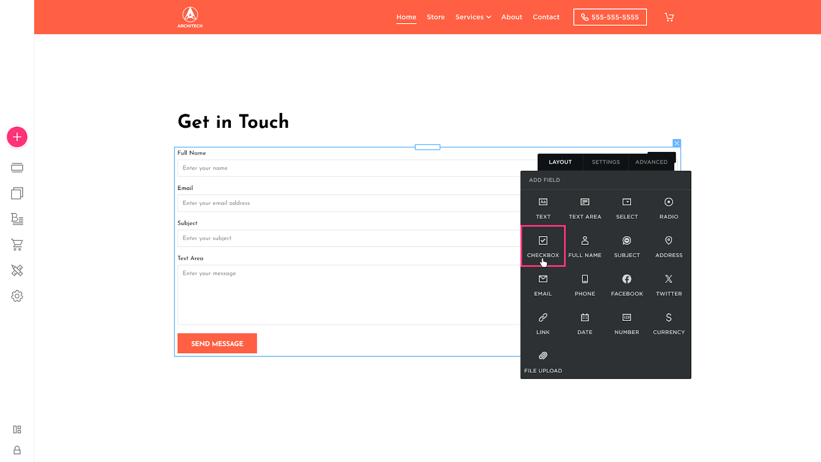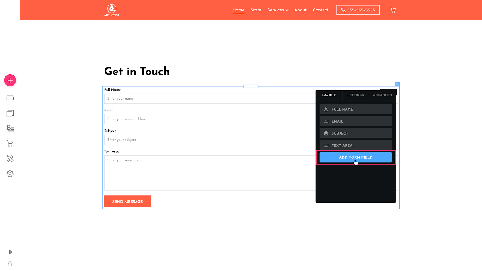- Select Layout and click Add the Form Field to add a new placeholder: